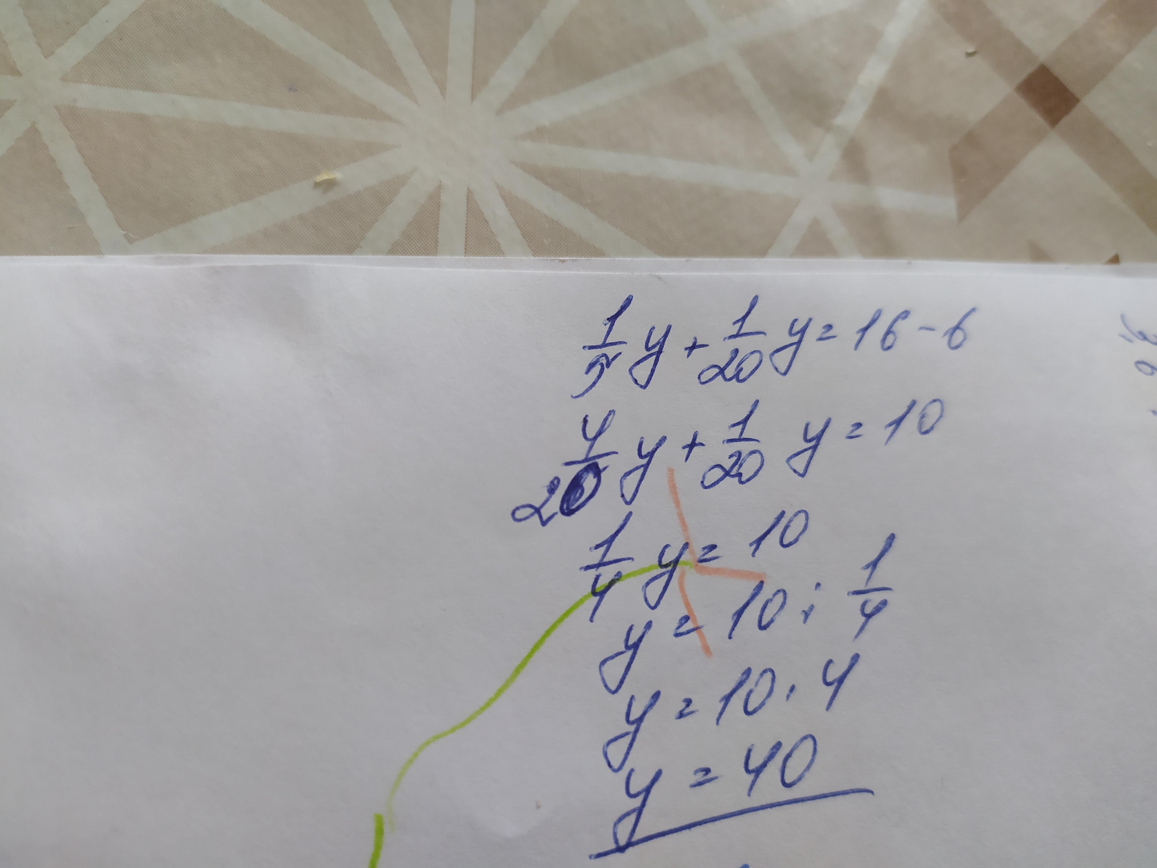 Реши уравнение: 1/5y+6=16-1/20y