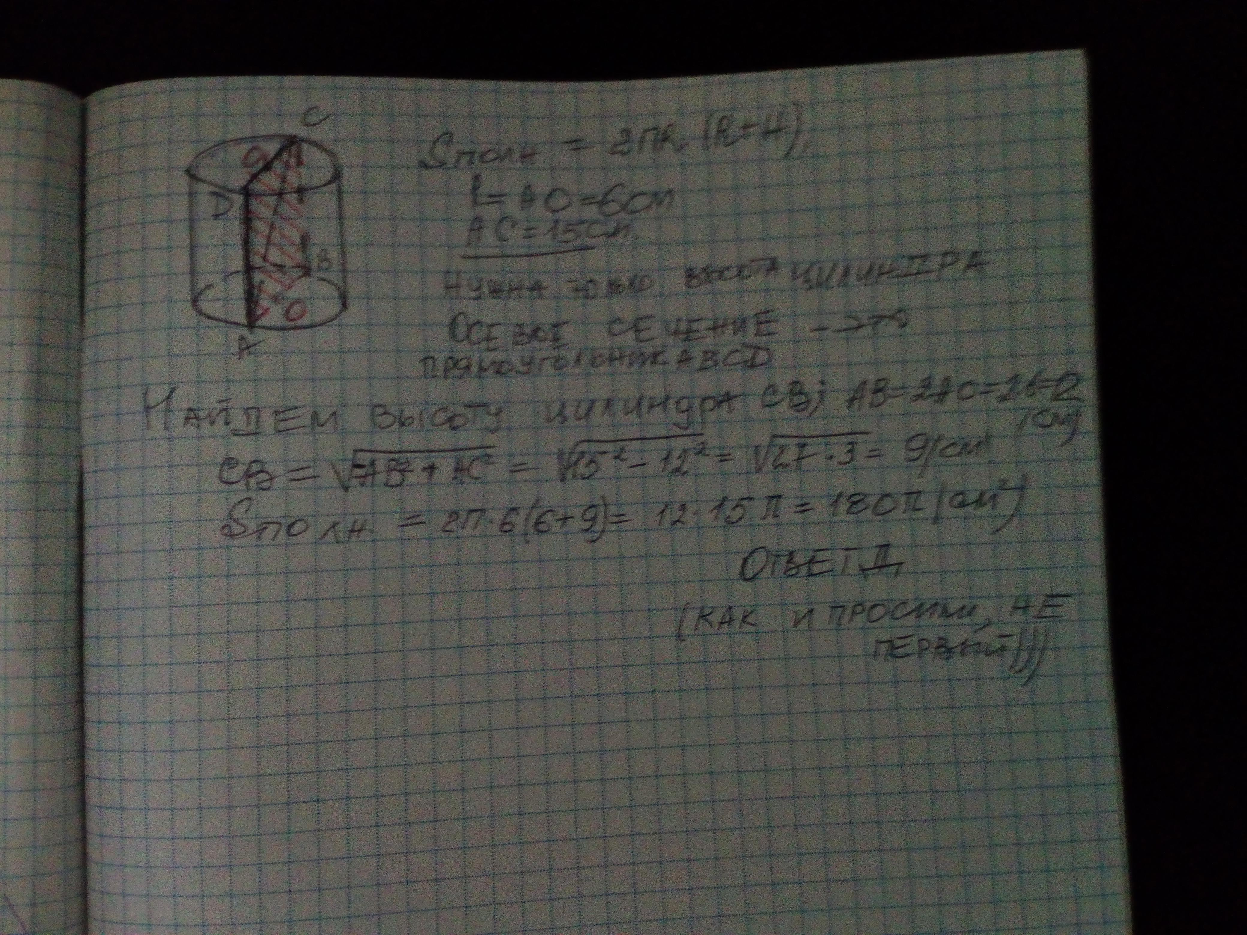 поверхности цилиндра, диагональ осевого сечения которого равна 15 см, а радиус основания - 6 см.