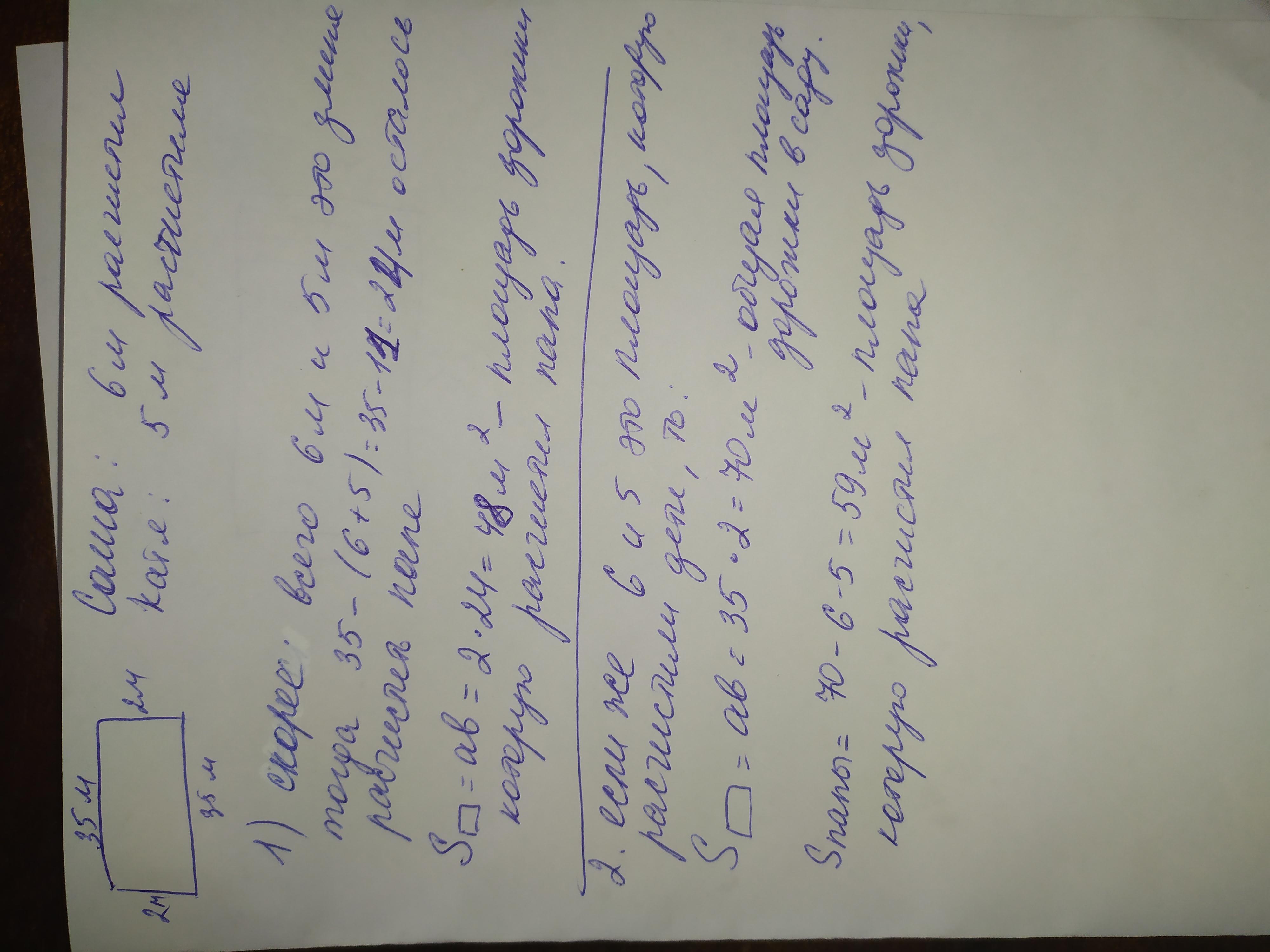 Длина прямоугольной дорожки в саду равна 35 м, а ширина — 2 м. Саша расчистил от снега 6 м этой дорожки, Катя расчистила 5 м этой дорожки, а оставшуюся часть дорожки расчистил папа.