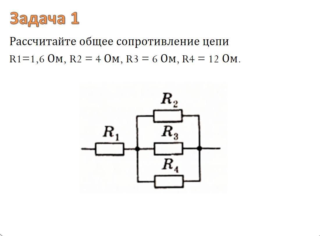 Можем заменить резисторы R2,R3,R4 одним резистором R5 с сопротивлением 2 Ом. тогда R1 и R5 соединены последовательно => их общее сопротивление R=R1+R5=1,6+2=3,6 Ом