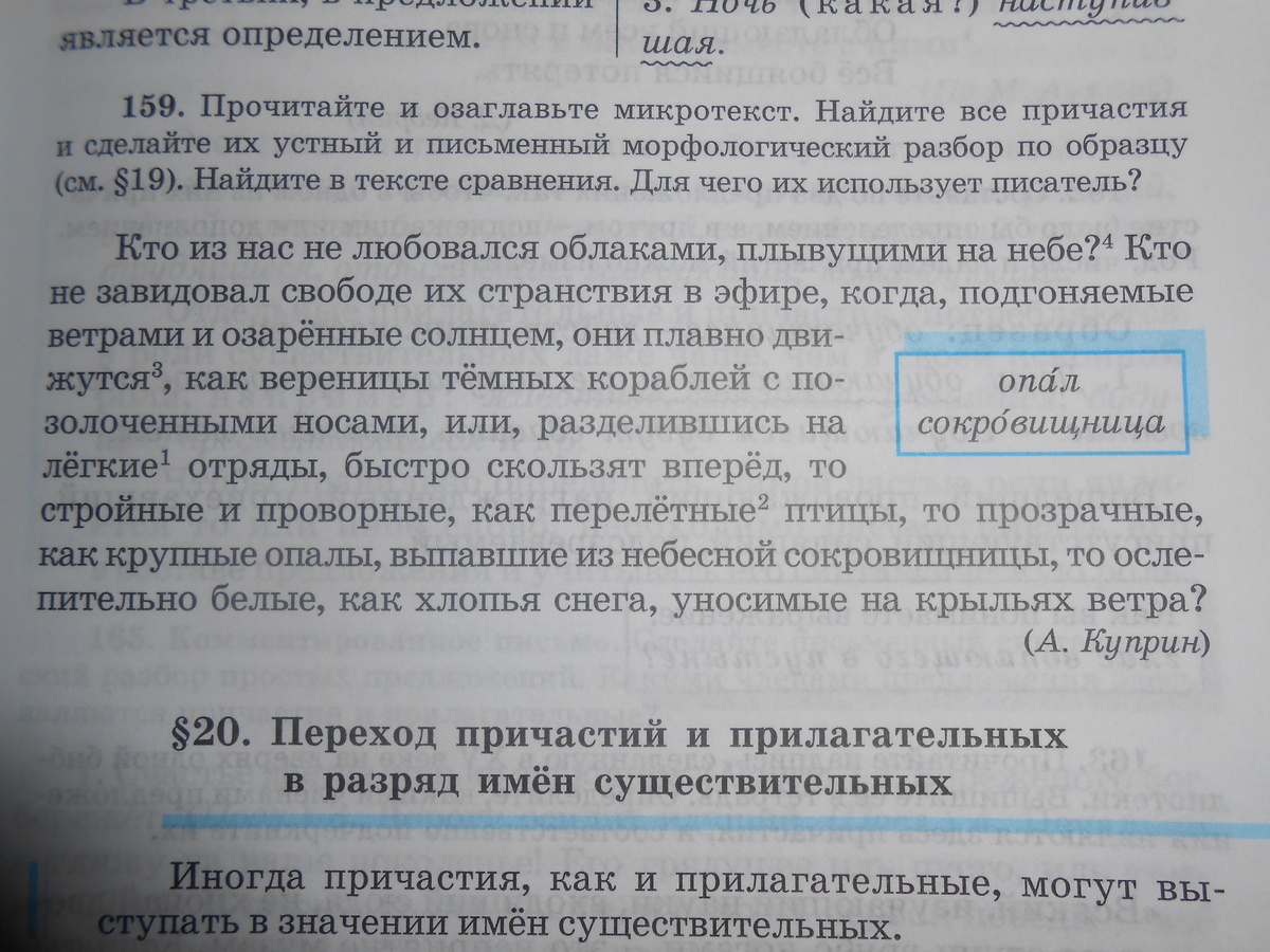 Упр. 159. Выписать 3 причастия и сделать с этими причастиями морфологический разбор.