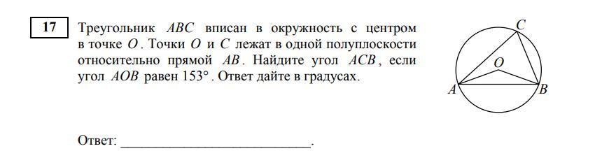 Угол AOB является центральным углом, ACB — вписанным. Оба угла опираются на одну и ту же дугу, следовательно, угол ACB в два раза меньше угла AOB. Тем самым, он равен 76,5°.