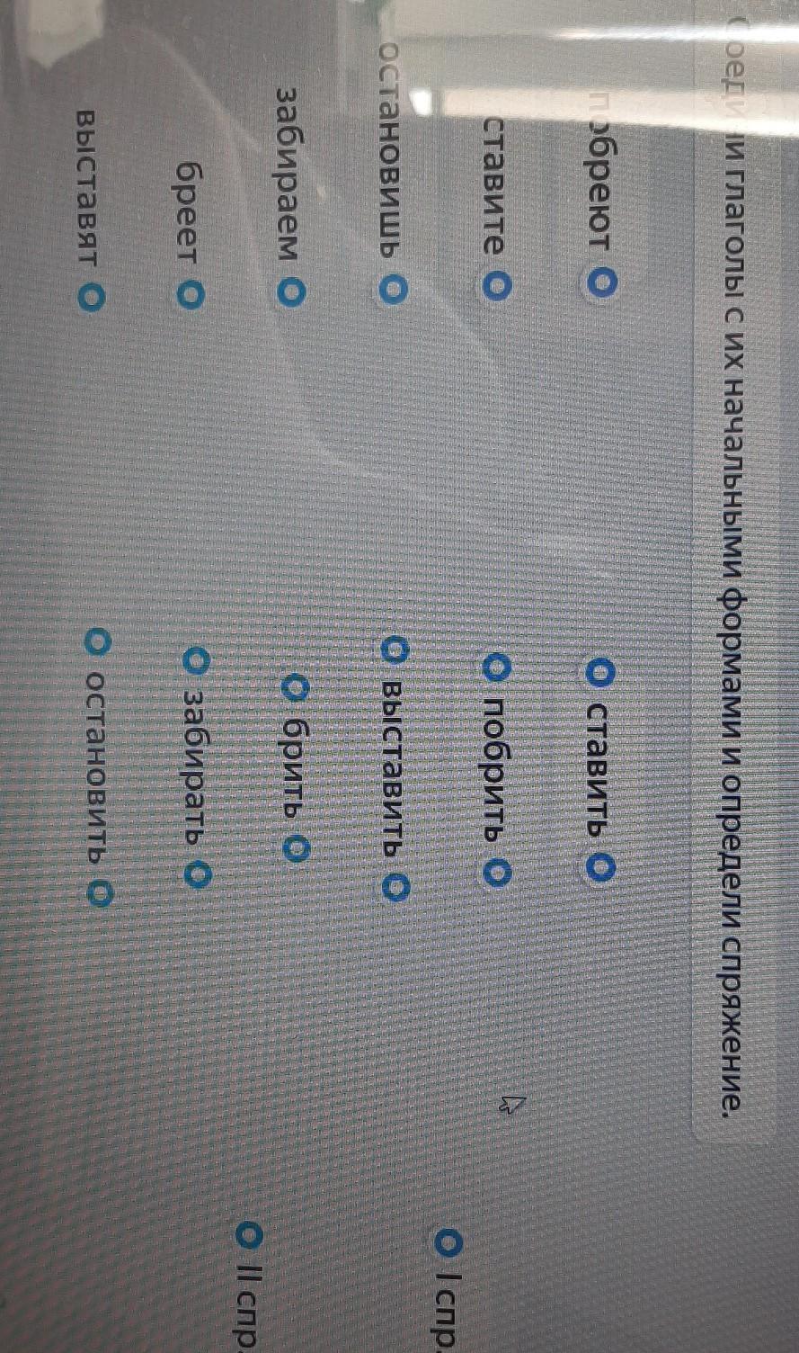 1 спряжение: побреют- побрить ( 1 спр ), ставите- ставить ( 2 спр ) остановишь- остановить ( 2 спр ), забираем- забирать ( 1 спр ) бреет- брить ( 1 спр ), выставят- выставить ( 2 спр ) .