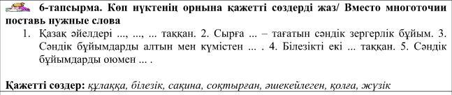 1.Қазақ әйелдері білезік, сақина, жүзік таққан. 2.Сырға құлаққа тағатын сәндік зергерлік бұйым. 3. Сәндік бұйымдарды алтын мен күмістен соқтырған. 4. Білезікті екі қолға таққан. 5. Сәндік бұйымдарды оюмен әшекейлеген