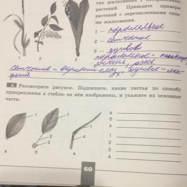 Рассмотрите рисунок. Подпишите, какие листья по способу прикрепления к стеблю на нём изображены, и укажите их основные части