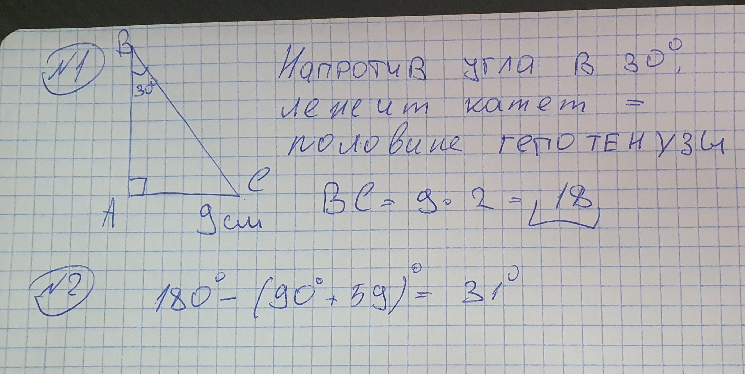 1.В ΔАВС, ےА=90°, АС=9см и ےВ=30°. Найти ВС.