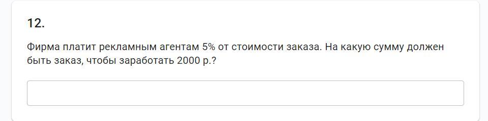 Пошаговое объяснение:чтобы посчитать сумму от заказа надо 2000 разделить на 100 и умножить на 5 то есть они получат от этого заказа 100