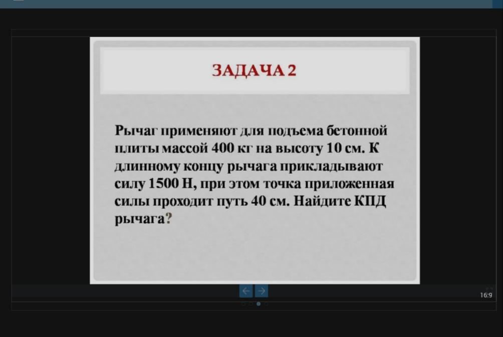 - КПД рычага находим как отношение полезной работы к общей, выраженное в процентах: η=(Aпол:Aобщ)×100%=(400(Дж):600(Дж))×100%=67%
