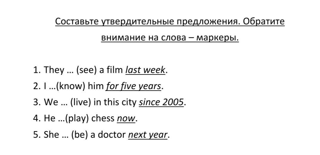 вспомогательным глаголом является Have, Has также глагол с 3 колонки неправильных глаголов. В 4 предложении Present Continuous, к глаголу добавляем окончание ing и вспомогательные глаголы am ( для I) , is ( he, she.it), are ( множественное число). В 5 предложении будущее время (Future Simple) есть только вспомогательный глагол will.