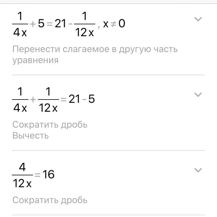 переносим числа с x на левую часть уравнения(то есть до знака равно), а без x на правую(то есть после знака равно). находим общий знаменатель, складываем. решаем как обычное линейное уравнение. при делении дробей используется правило: вторую дробь переворачиваем, а знак деление превращается в знак умножения. а при умножении в данном случаи четверки сокращаются. остается 12