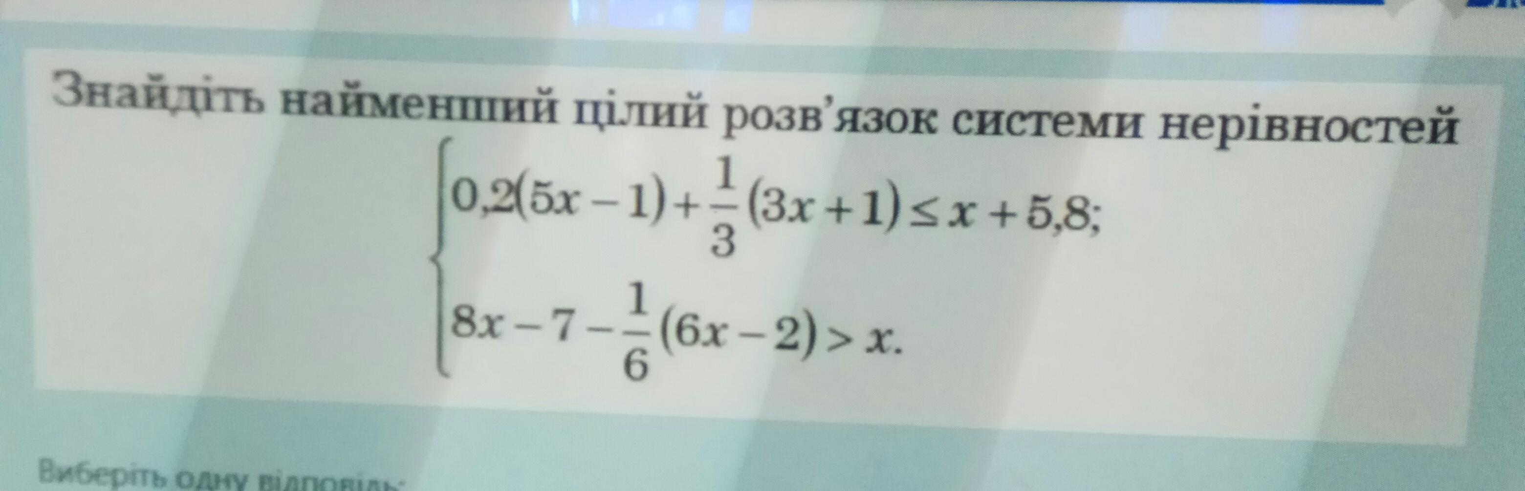 Найдите наименьшее целое решение системы неравенств, которые на фото. Варианты ответа: -1; 2; 1; 0