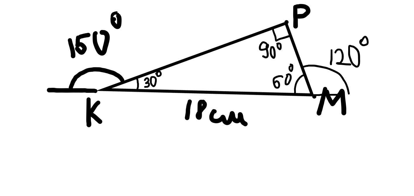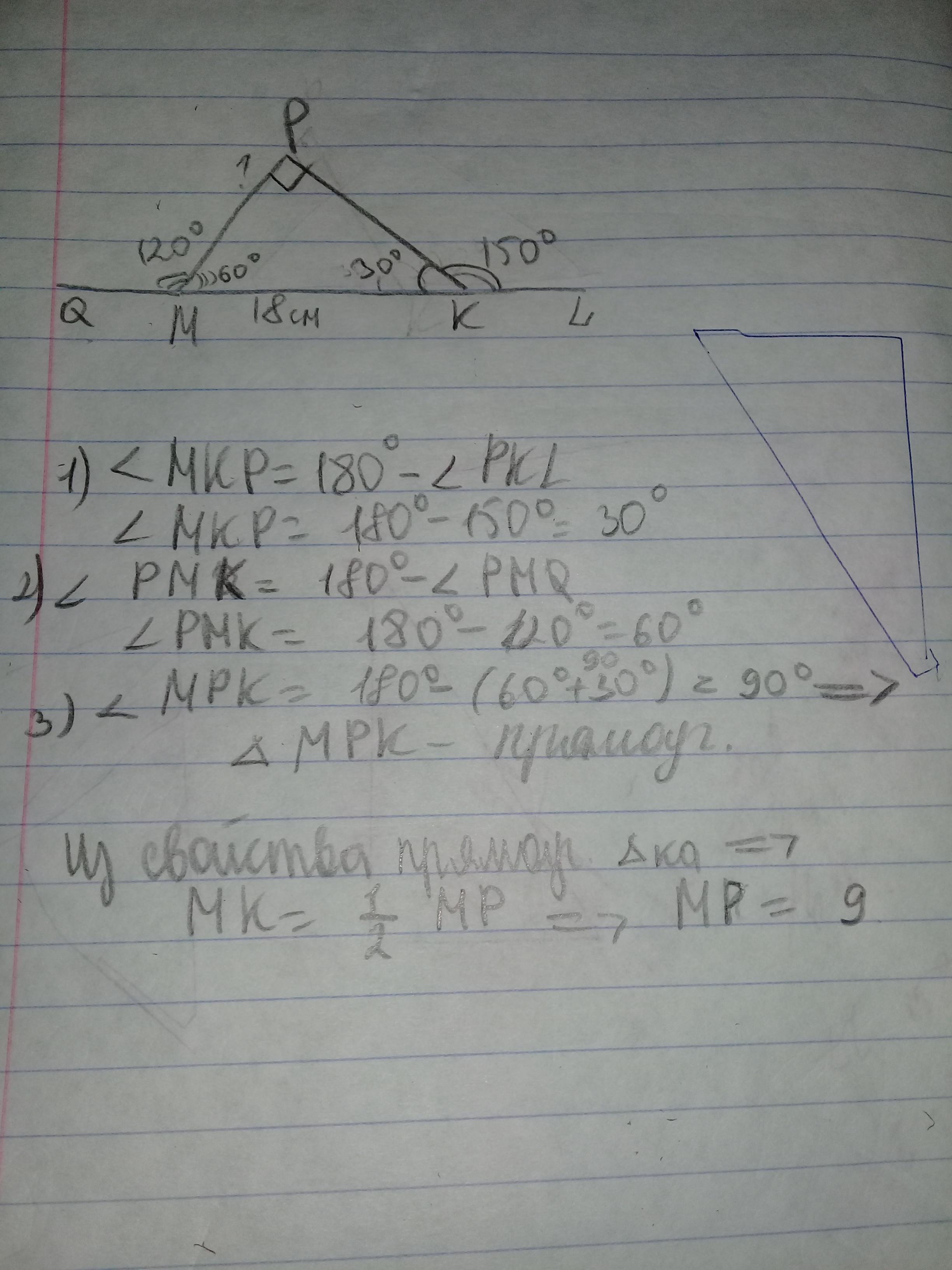 Длина стороны МК треугольника МРК равна 18 см Внешний угол треугольника при вершине К равен 150 градусов, а внешний угол при вершине М 120 градусов. Найдите длину стороны МР треугольника. Плиз и рисунок тоже.