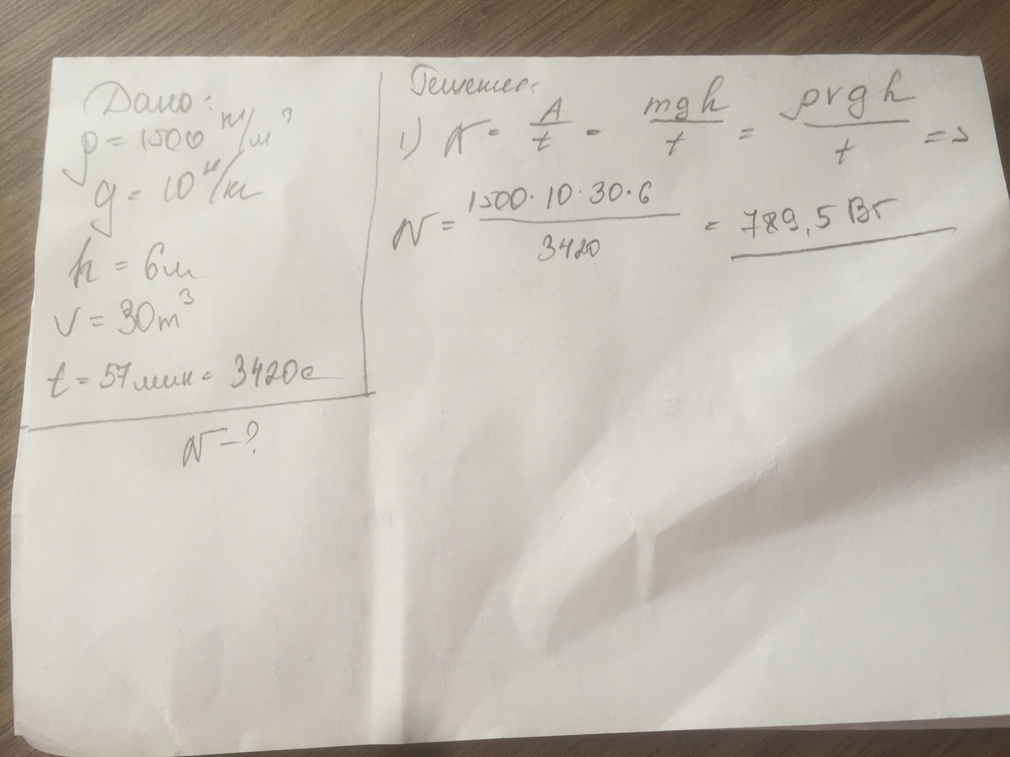 A=mg*h m=p*V N=A/t=p*V*g*h/t=1500*30*10*6/57*60=789,5 Вт