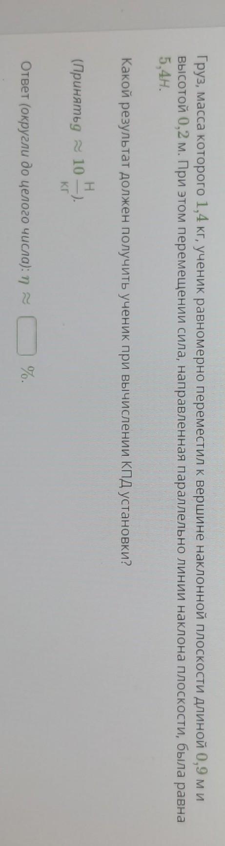 m=1.4 кг L=0.9 м h=0.2 м F=5.4 H η=?