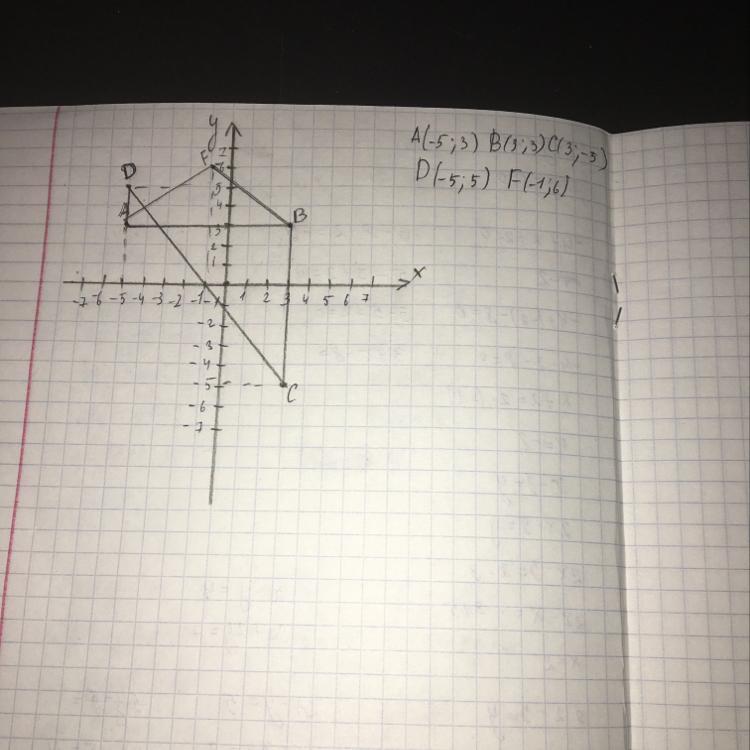 Начертите плоскость . Отметьте координаты точек: А(-5;3),В( 3;3),С(3;-5),D(-5;5),F(-1;6) соедините попарно отрезки AB,BC,CD,DA,AF,FB.