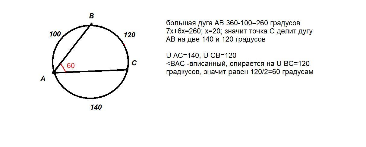 Точки А и В разделяют окружность на две дуги, меньшая из которых равна 100º, а большая точкой С делится в отношении 7:6, считая от точки А. Найдите угол ВАС.