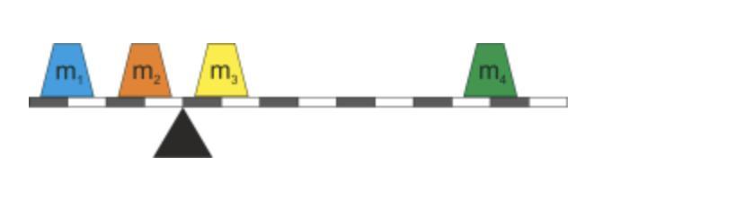 Дан невесомый рычаг с двумя противовесами на каждой стороне. Массы противовесов 1=9 кг, 2=79 кг и 3=18 кг. Какова масса противовеса 4, если рычаг находится в равновесии?