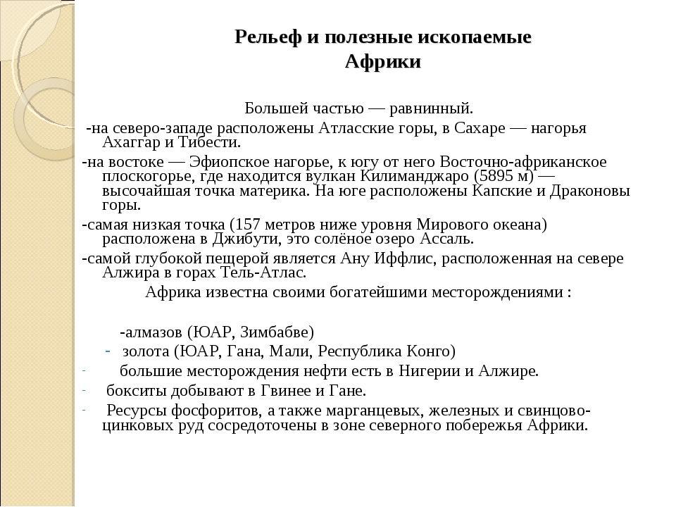 Более молодые, слабометаморфизованные породы заключают залежи оловянных, вольфрамовых, медных, свинцовых, цинковых и урановых руд. Африка обладает крупными запасами железных, марганцевых руд, хромитов, бокситов, меди, кобальта, фосфоритов, олова, сурьмы, лития, урана, асбеста, золота, платины и платиноидов, алмазов.