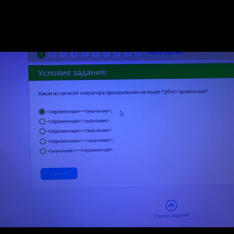 Правильный оператор присваивания в языке Python: <переменная> = <значение>