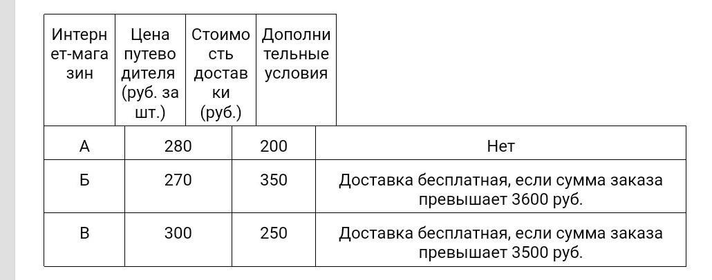 Для группы иностранных гостей требуется купить 12 путеводителей. Нужные путеводители нашлись в трёх интернет-магазинах. Цена путеводителя и условия доставки всей покупки приведены в таблице.