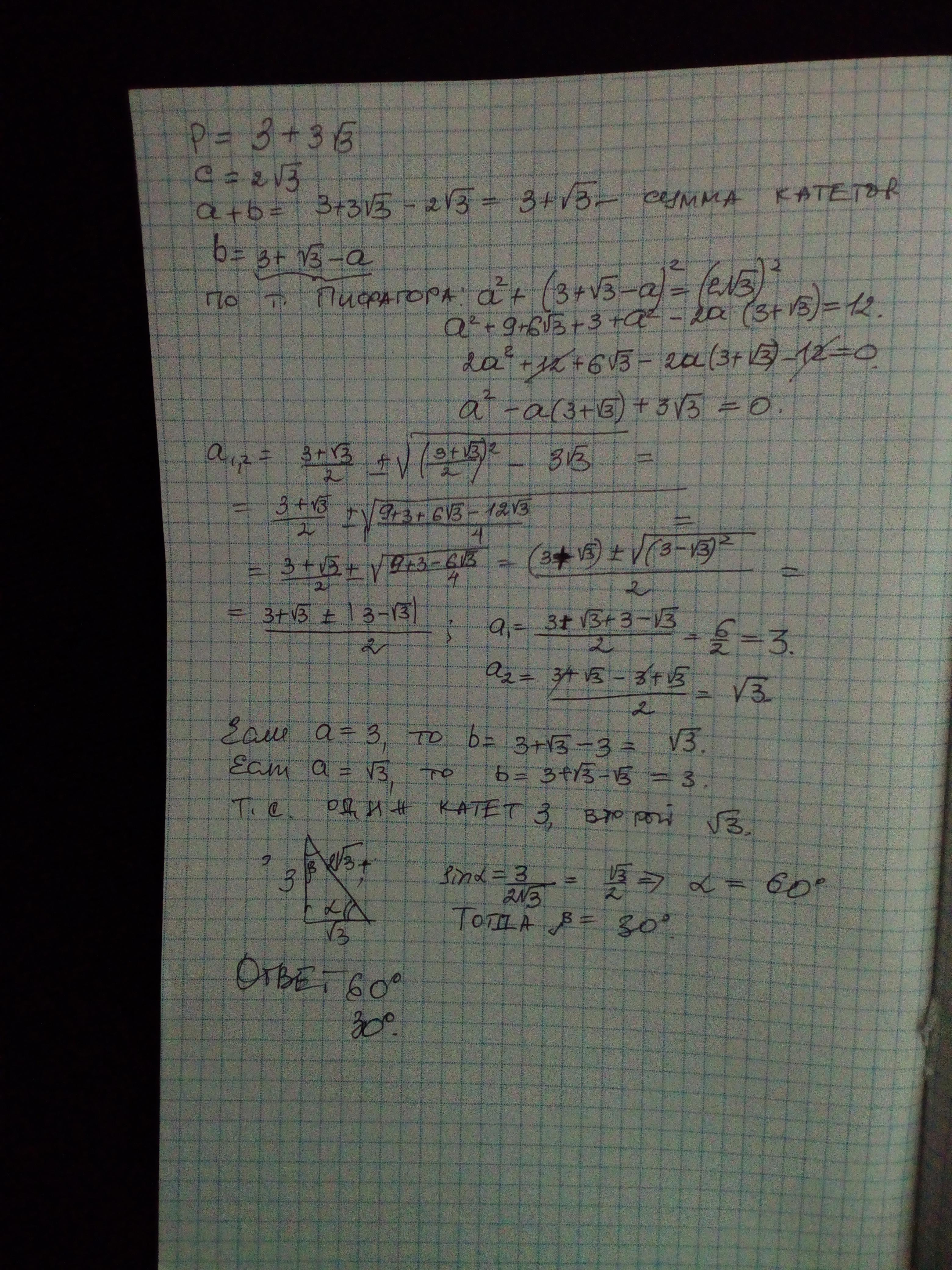Помоги те пожалуйста решить задачу. Очень срочно надо.Найдите острые углы прямоугольного треугольника, если его гипотенуза равна 2√3, а периметр равен 3(1+ √3).
