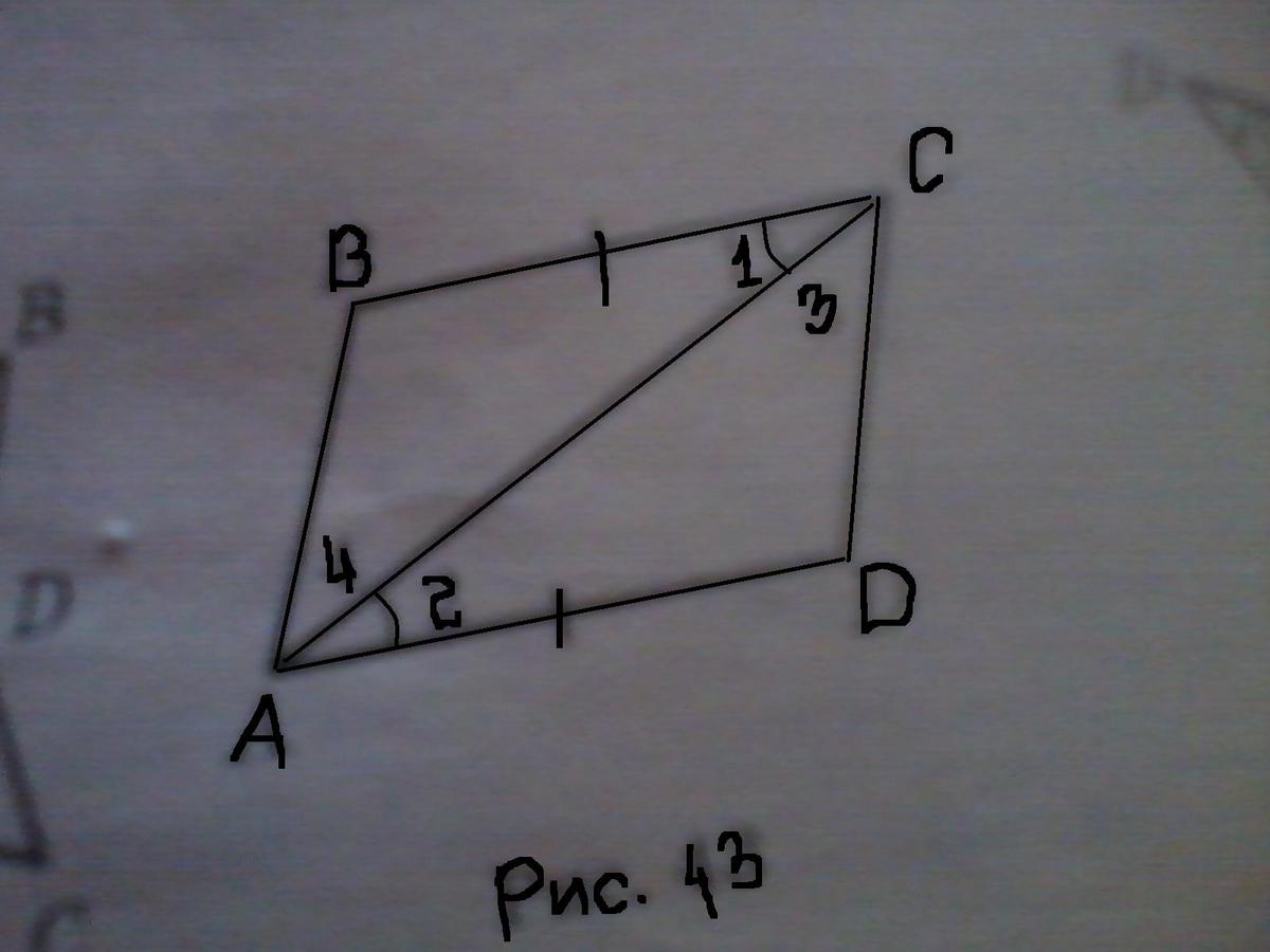 На рисунке 43- BC=AD, угол 1=углу 2.1) Докажите,что треугольник ABC=треугольнику CDA. 2) Найдите AB и BC,если AD=17см,DC=14 см.