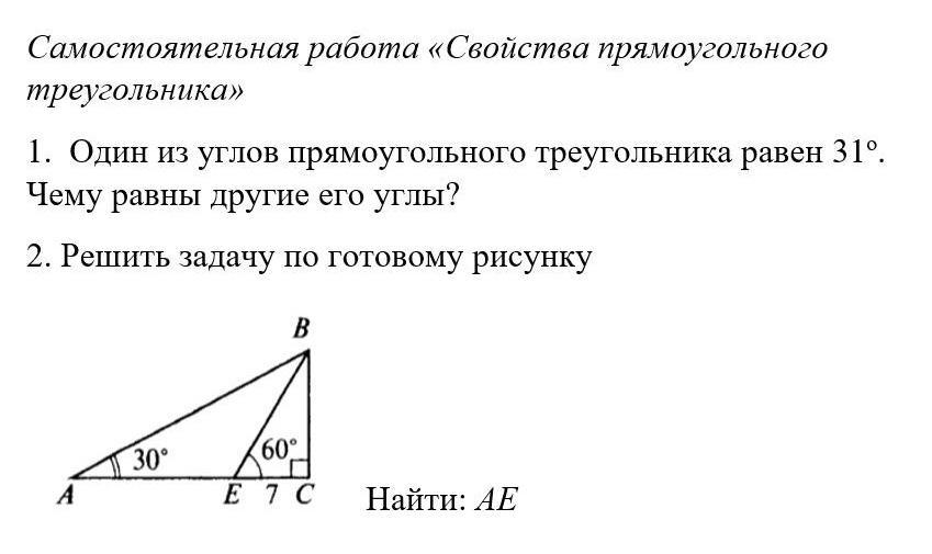 1. Один из углов прямоугольного треугольника равен 31 градус.