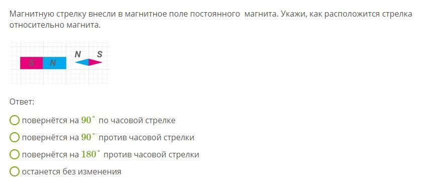 Магнитную стрелку внесли в магнитное поле постоянного магнита. Укажи, как расположится стрелка относительно магнита.