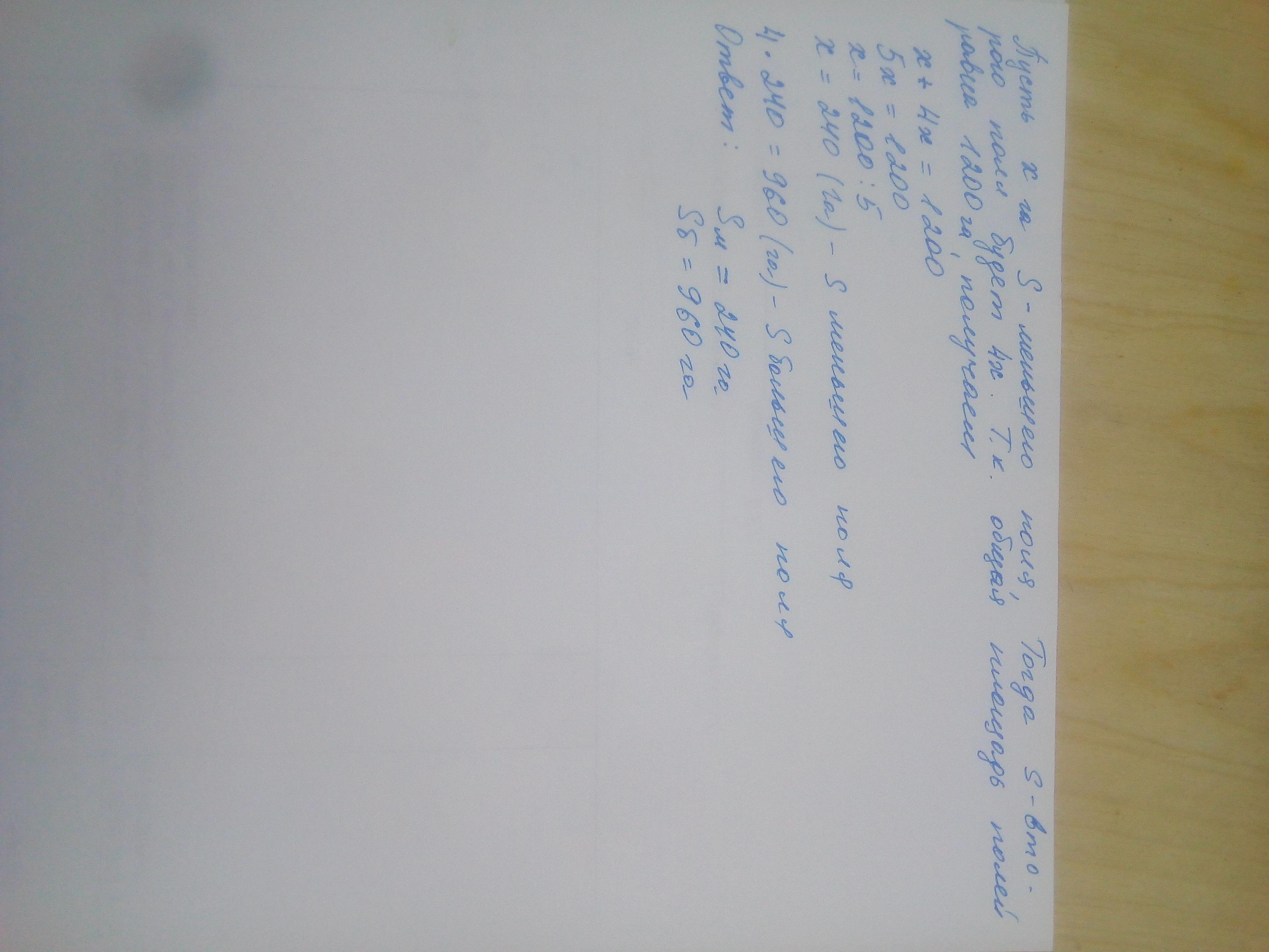 Помогите по быстрей задача. Одно поле в 4 раза больше другого, а общая площадь этих полей 1200га. Найдите площадь каждого поля.