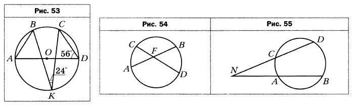 Хорды АВ и CD окружности пересекаются в точке F (рис. 54). Найдите угол AFD, если ∪AD = 142°, ∪ВС = 116°.
