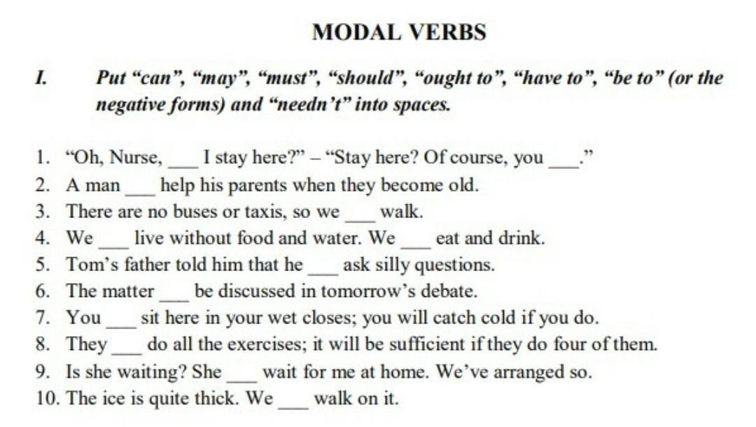 1have to. 2must. 3ought to. 4be to. 5can. 6may. 7should. 8neednt 9can. 10 be to назначь как лучший ответ