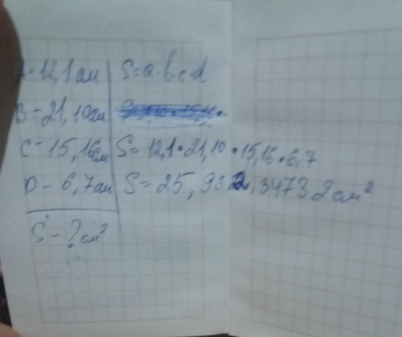 Докажи, что четырёх угольник ABCD является прямоугольником, найди его площадь, если А(12,1),B(21,10),C(15,16) и D(6,7)