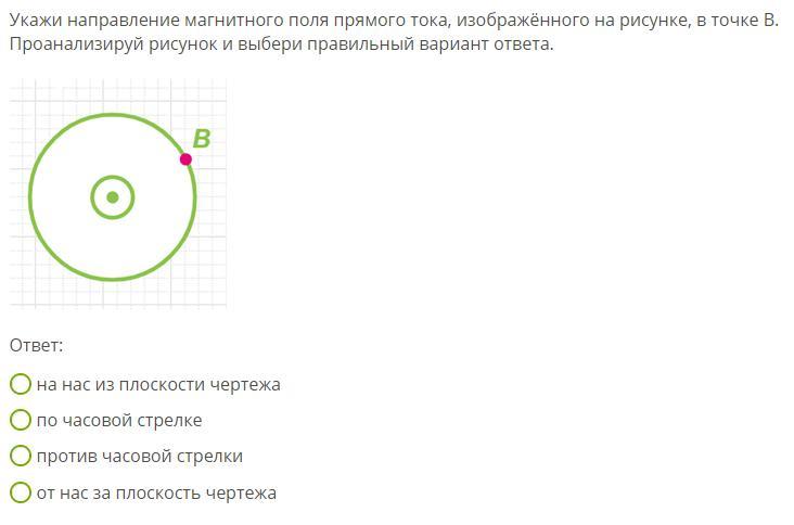 Укажи направление магнитного поля прямого тока, изображённого на рисунке, в точке В.