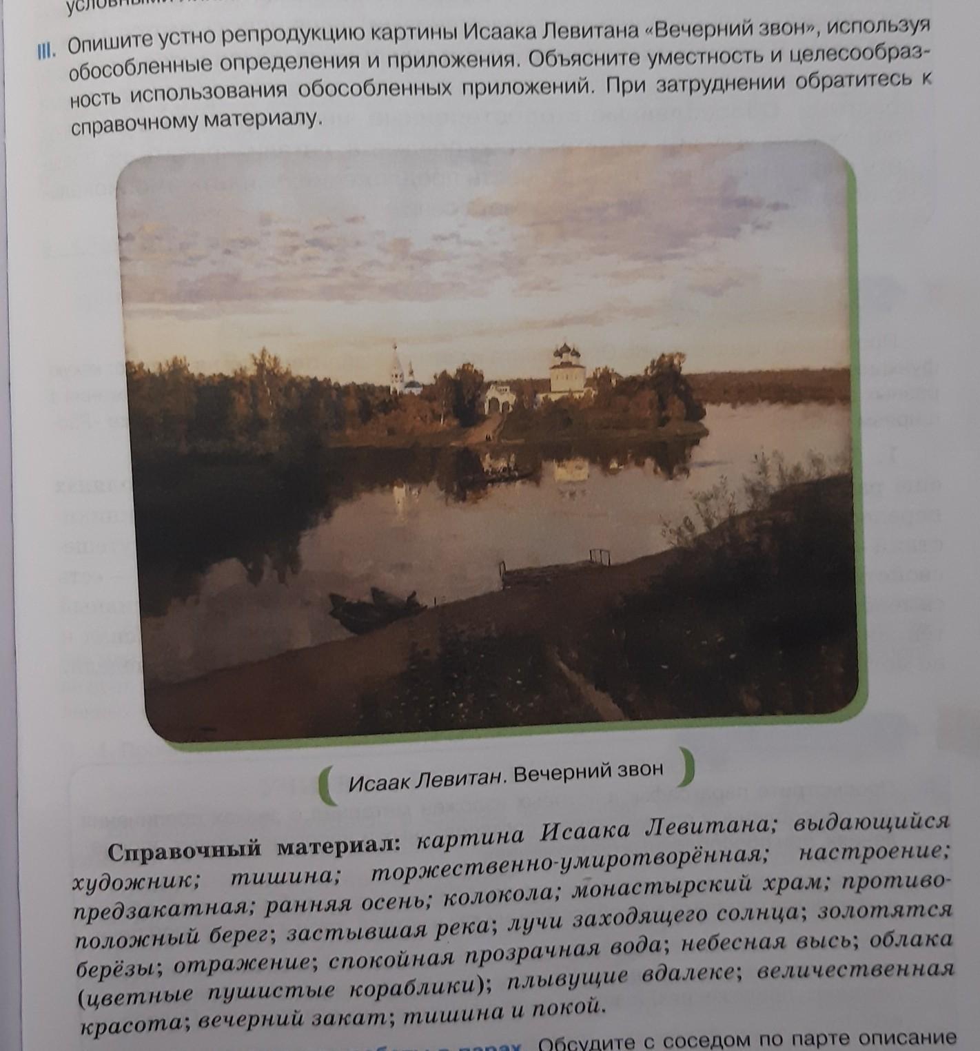 Ответ:На картине Исаака Левитана,"Вечерний звон",изображена торжественно-умиротворенная , осенняя природа,на заднем плане, художник изобразил белокаменный монастырский храм и колокольню.Монастырь стоит на противоположном берегу, застывшей и блестящей в лучах заходящего солнца,реки.