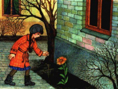 На першій картинці зображено, як дівчинка прийшла подивитися на нагідку, яку колись посадив Фрідріх. Поруч із нею стояв зроблений з паличок і зв'язаний дівчинкою та її друзями хрест.