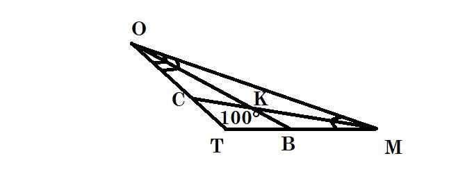 В треугольники TOM проведены биссектрисы MC и OB, которые пересекаются в точке K.Угол T равен 100 градусов.Найдите угол MKB