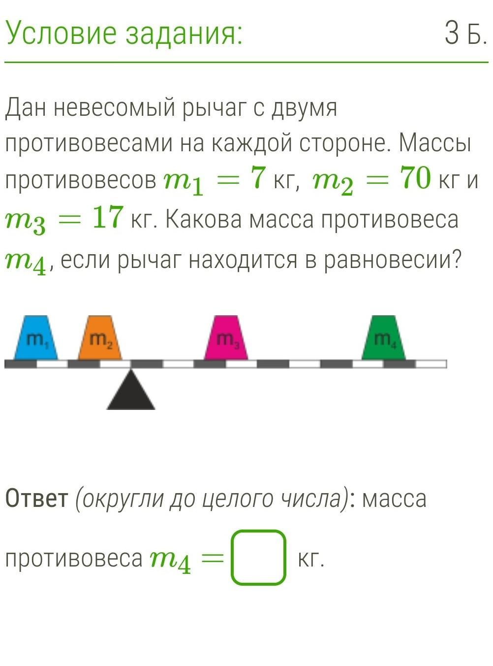 Дан невесомый рычаг с двумя противовесами на каждой стороне. Массы противовесов m1=7 кг, m2=70 кг и m3=17 кг. Какова масса противовеса m4, если рычаг находится в равновесии?