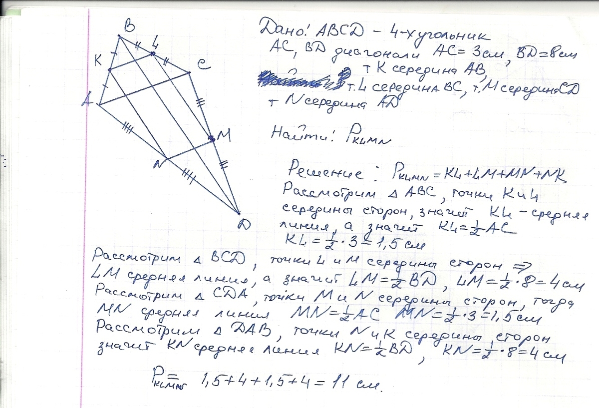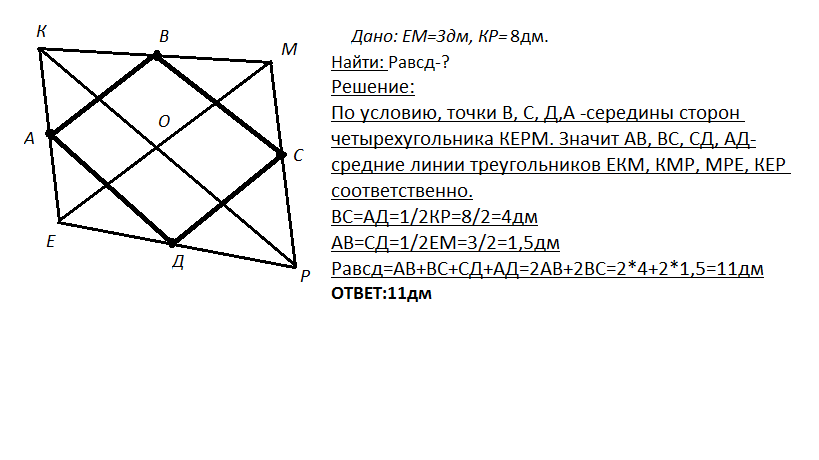 Диагонали четырёхугольника 3 дм и 8 дм.Найдите периметр четырёхугольника,вершинами которого служат середины сторон данного четырёхугольника.