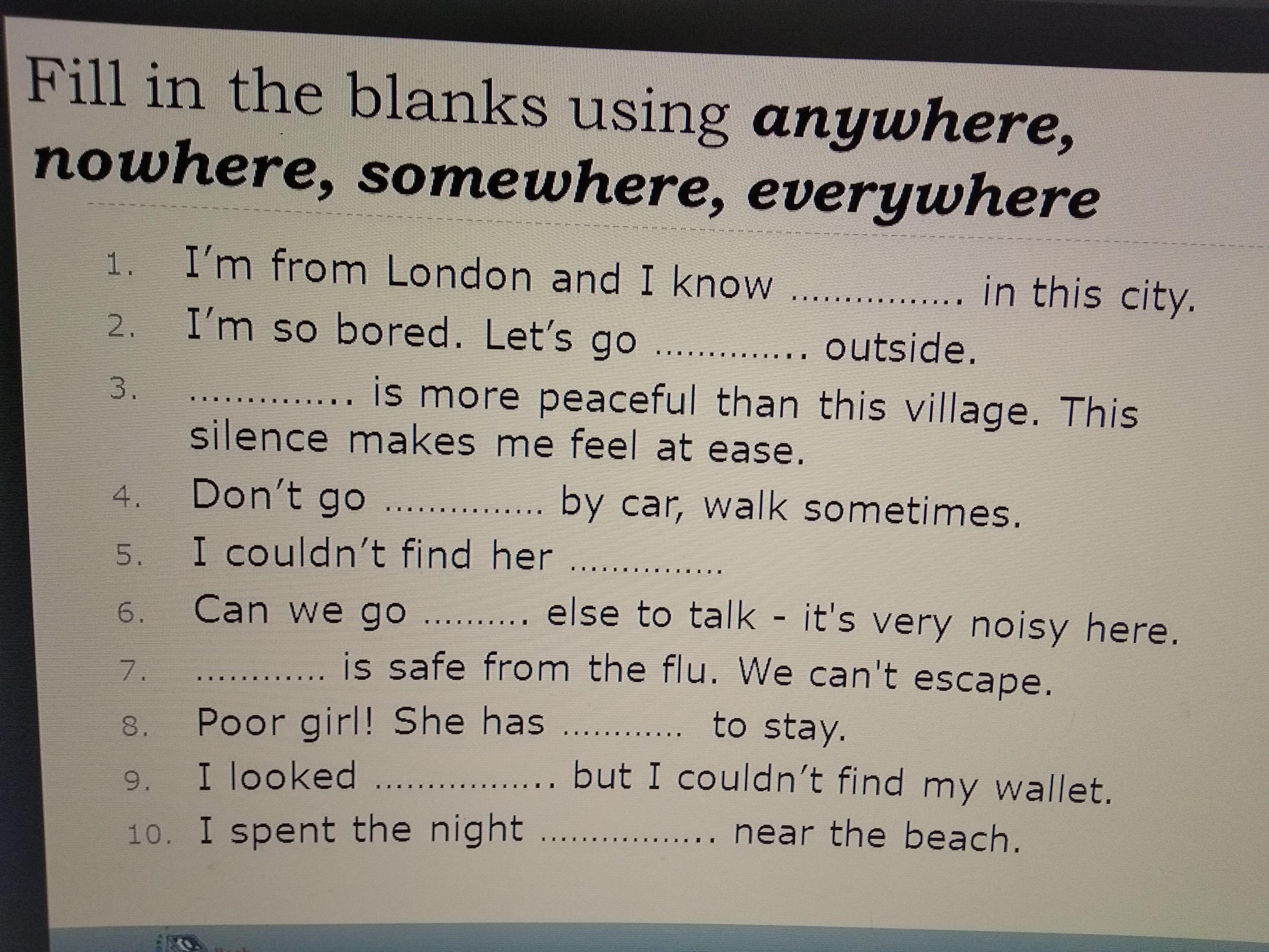 Помогите пожалуйста с английским языком. Вставьте anywhere,nowhere,somewhere,everywhere