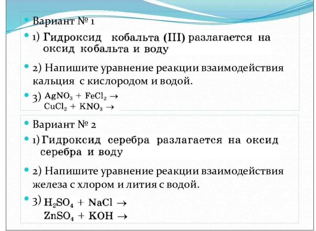3) H2SO4 + NaCl ≠ (р-ия не пойдет, т.к. не выделяется ни осадок, ни газ, ни вода)