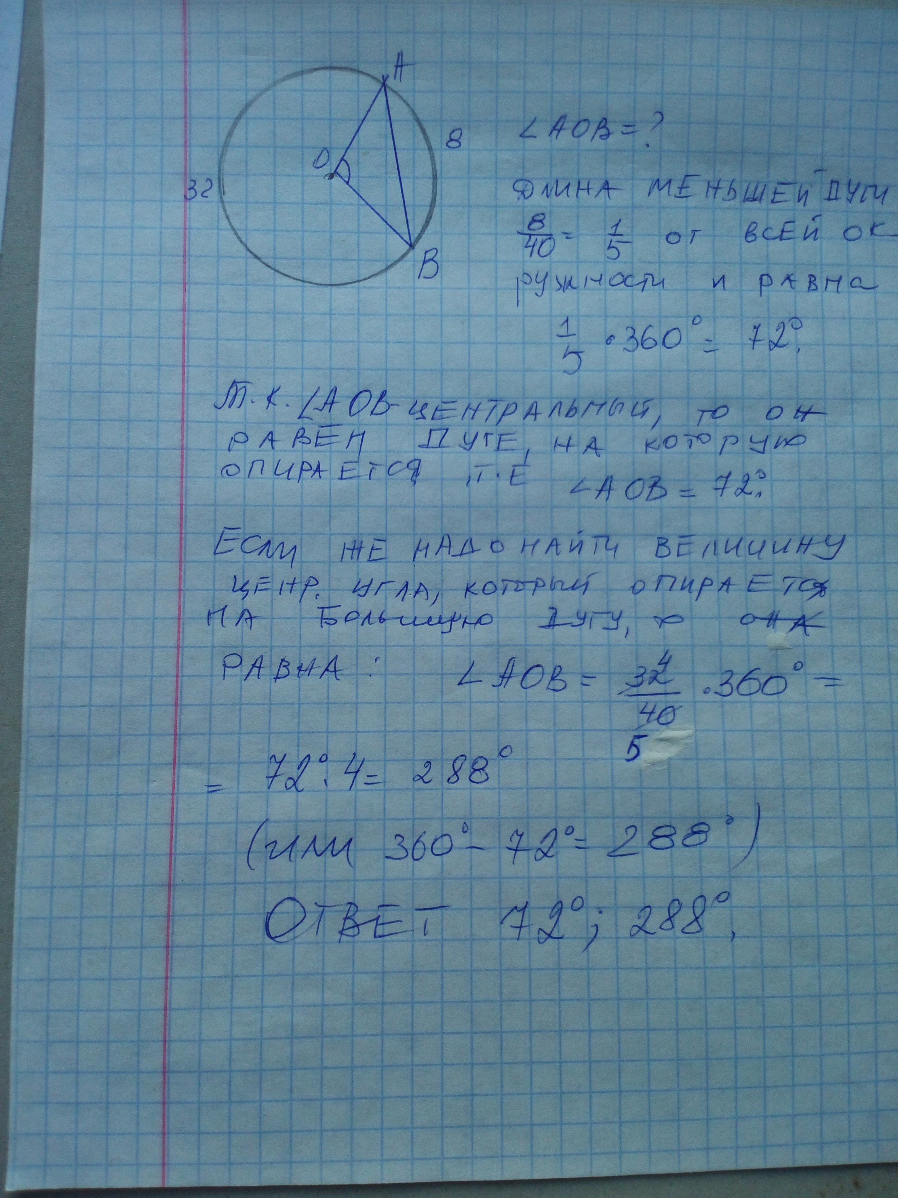 На окружности с центром О отмечены точки А и B так, что длина меньшей дуги AB равна 8, а длина большей дуги равна 32. Найдите угол AOB. Ответ дайте в градусах.