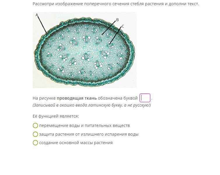 Рассмотри изображение поперечного сечения стебля растения и дополни текст.