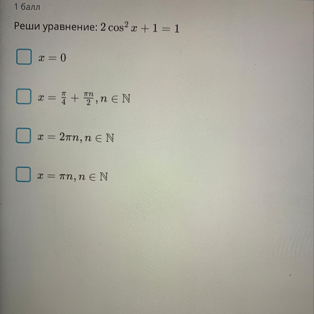 Косинус равен нулю в точках pi * n, n принадлежит множеству целых чисел. Следовательно, последний вариант ответа - правильный