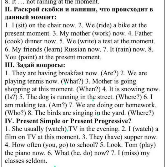 4.Father is cooking dinner now. 5.We are writing a test at the moment. 6.My friends are learning Russian now. 7.It is raining now. 8.You are painting at the present moment.