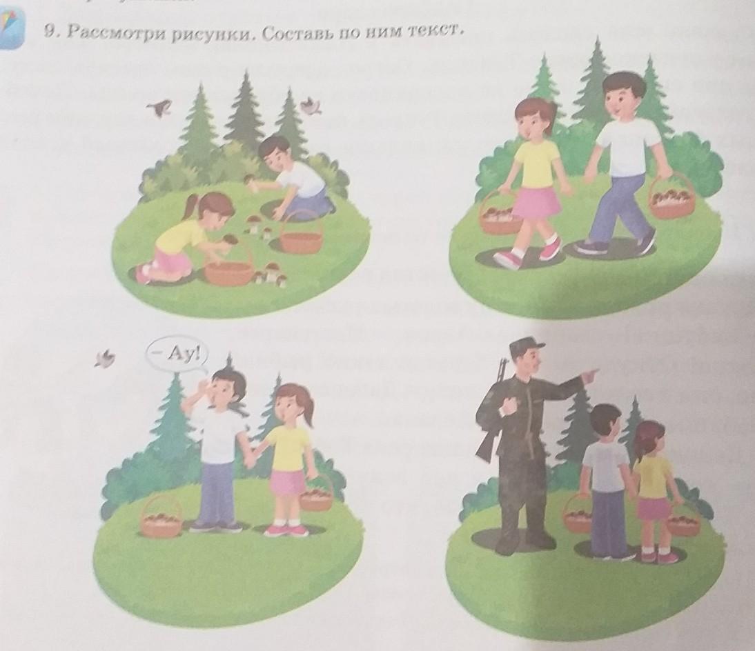Ответ: В один летний день Андрей и Наташа пошли в лес собирать грибы. Ребята были очень рады тому, когда увидели их на поляне. После того, как грибы оказались в корзинках, Наташа и Андрей решили вернуться домой. Они долго петляли, а потом поняли, что заблудились. Наташа сильно расстроилась, и Андрей взял её за руку, чтобы успокоить, и стал звать на помощь. Его крик услышал охотник и поспешил к источнику шума. Он быстро нашёл ребят и показал в каком направлении нужно идти. Они смело отправились домой.