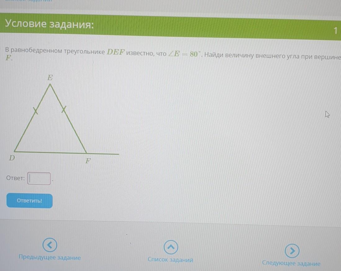 т. к треугольник р/б=> угол Д равен углу Ф равен 50°