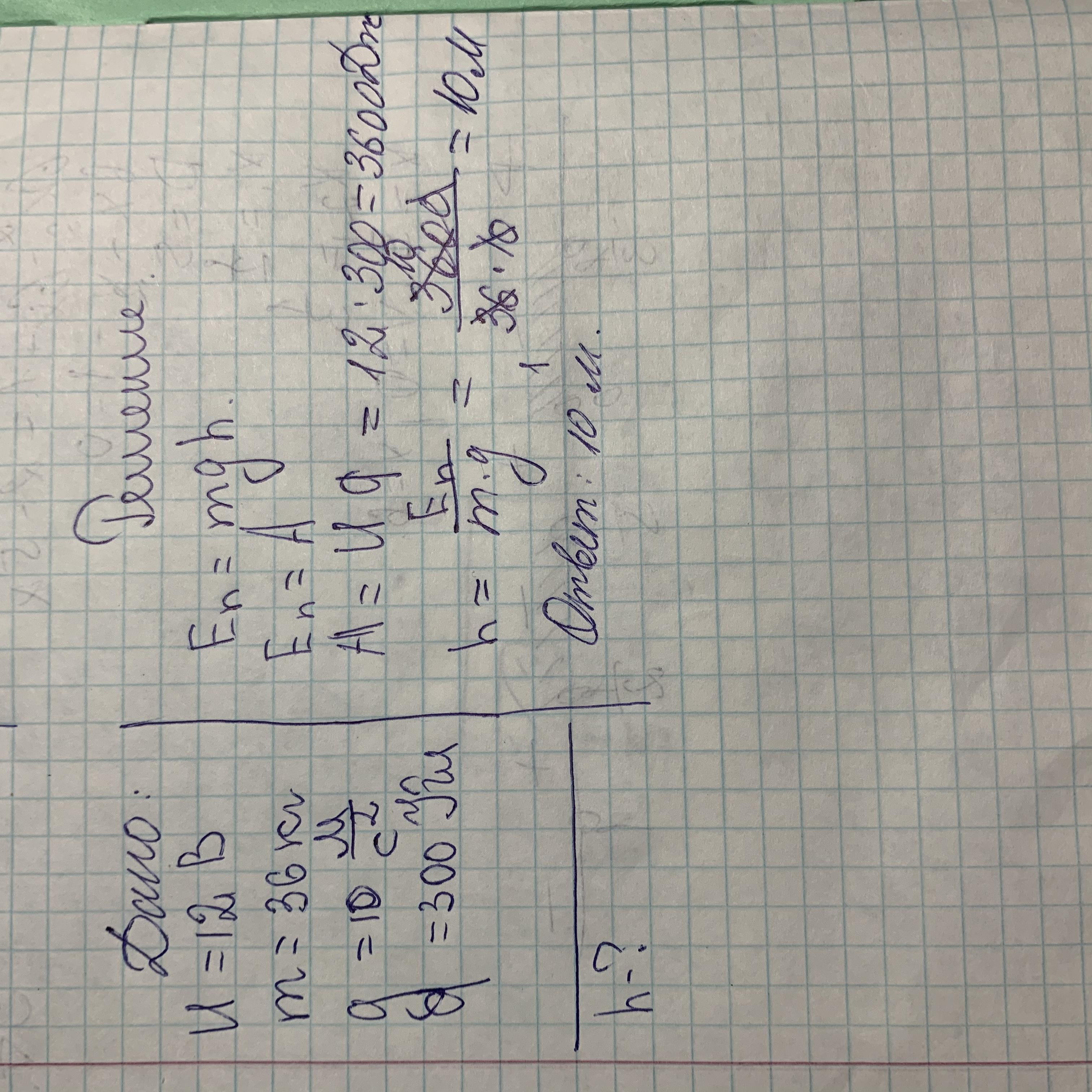 Напряжение на клеммах автомобильного аккумулятора составляет 12 В. С какой высоты должен упасть груз массой 36 кг, чтобы сила притяжения выполнила такую же работу, которую выполняет электрическое поле, перемещая заряд 300 Кл по одному из электрических цепей автомобиля?