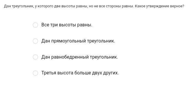 Дан треугольник, у которого две высоты равны, но не все стороны равны. Какое утверждение верное?