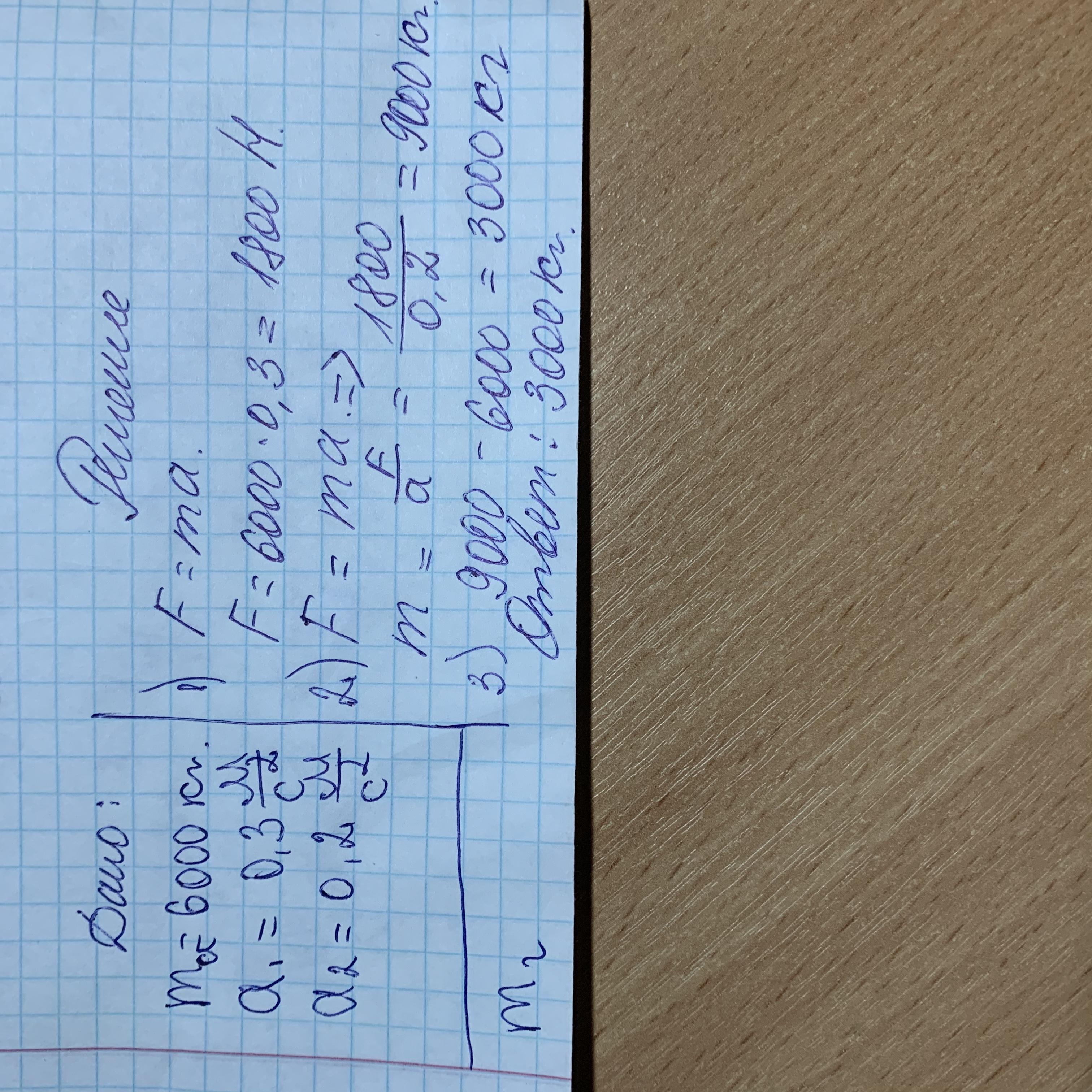 Пустой грузовой автомобиль массой 6т начал движение с ускорением 0,3м/с2. Какова масса груза, взятого автомобилем, если при той же силе тяги он трогается с места с ускорением 0,2 м/с2?