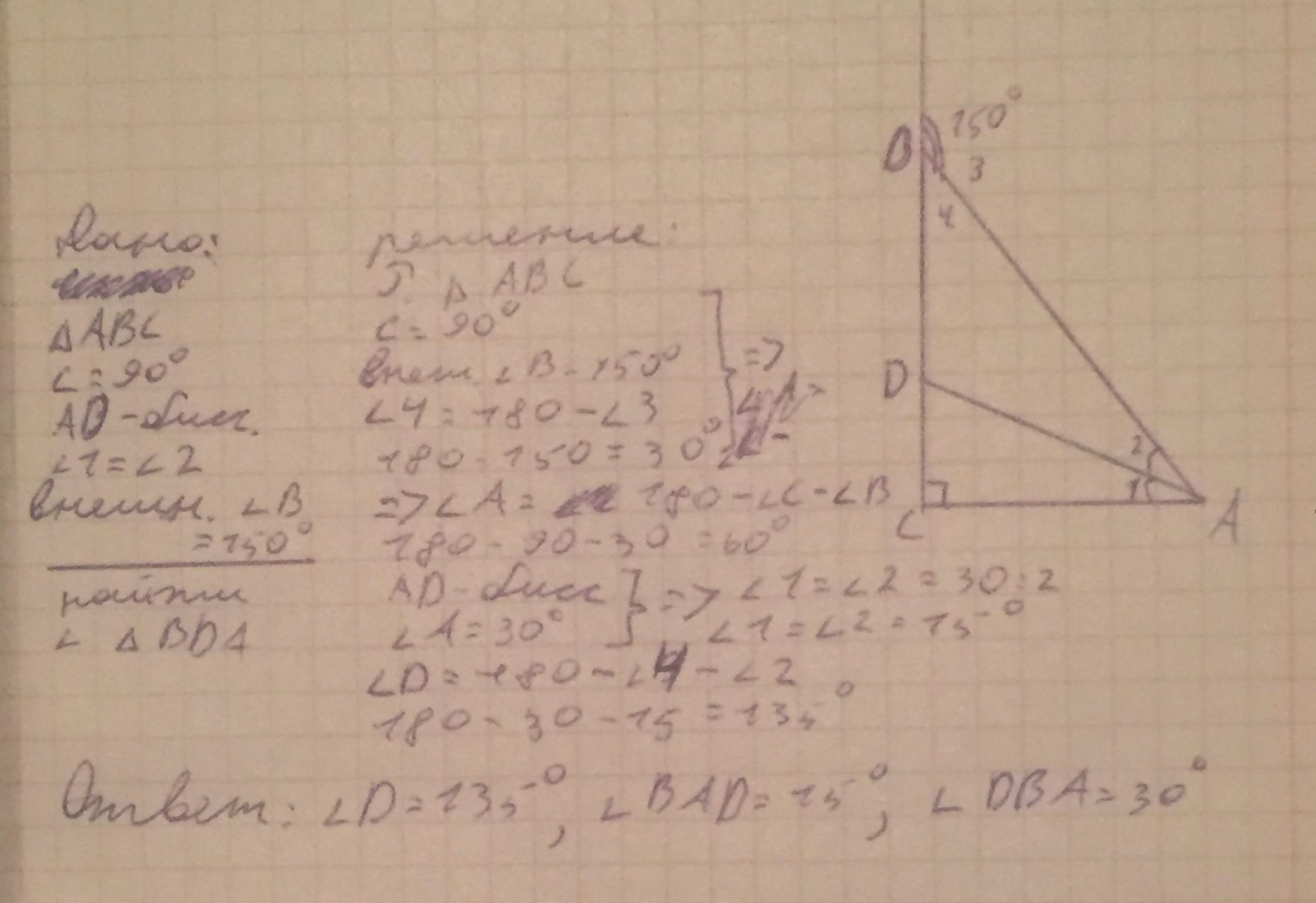 2. Из вершины А прямоугольного треугольника АВС с прямым углом С проведена биссектриса AD, внешний угол при вершине В равен 150°. Найдите углы треугольника BDA.